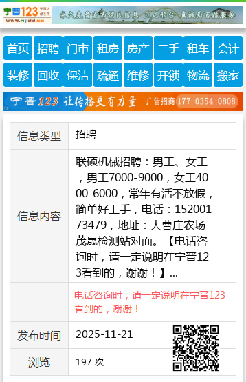 联硕机械招聘:男工、女工,男工7000-9000,女工4000-6000,常年有活不放假,简单好上手,电话:15200173479,地址:大曹庄农场茂晟检测站对面。 【电话咨询时,请一定说明在宁晋123看到的,谢谢!】 |