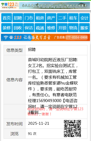 县城妇幼院附近液压厂招聘:女工2名。招实验台测试工,打包工,双面铣床工,库管一名。(要求有机械加工管库经验熟悉管家婆hu金蝶软件),要求男,能吃苦耐劳,有责任心。有意者电联范经理15690493000 【电话咨询时,请一定说明在宁晋123看到的,谢谢!】 |