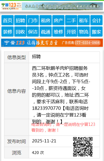 西二环耿鹏羊肉炉招聘服务员3名,钟点工2名,可选时间段上午9点-2点,下午5点--10点,薪资待遇面议,女的男的都可以,地址:西二环,要求干活麻利,联系电话18233970770 【电话咨询时,请一定说明在宁晋123看到的,谢谢!】 |