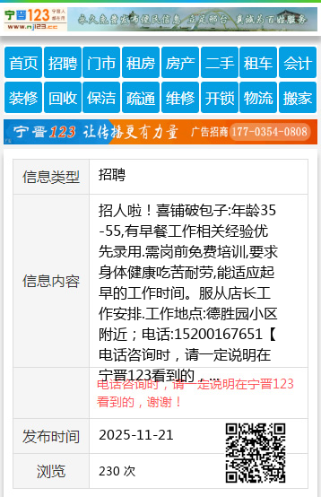 招人啦!喜铺破包子:年龄35-55,有早餐工作相关经验优先录用.需岗前免费培训,要求身体健康吃苦耐劳,能适应起早的工作时间。服从店长工作安排.工作地点:德胜园小区附近;电话:15200167651 【电话咨询时,请一定说明在宁晋123看到的,谢谢!】 |