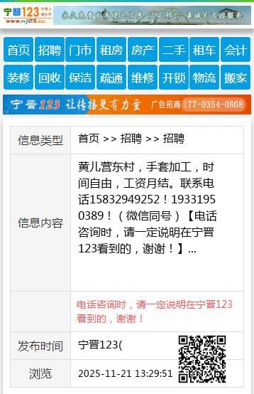 | 防骗提醒: | 宁晋123(www.nj123.cc)提醒您:手工活、网络兼职、刷单,都是骗子!凡以各种名义收取费用的都是骗子!找工作是往兜里挣钱,让你往外掏钱的都是骗子!异地招聘请提高警惕,谨防诈骗! |