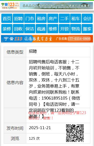 招聘纯售后电话客服;十二月初开始培训,不销售,不销售,倒班,每天八小时,双休,双休,十八到三十五岁,业务简单易上手,有意向抓紧时间联系我啦!联系电话:19061895105(微信同号) 【电话咨询时,请一定说明在宁晋123看到的,谢谢!】 |