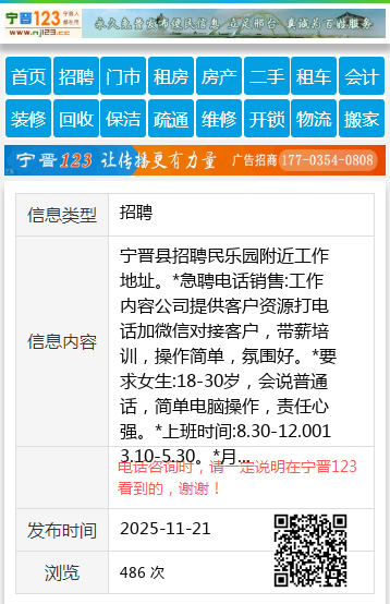 宁晋县招聘民乐园附近工作地址。*急聘电话销售:工作内容公司提供客户资源打电话加微信对接客户,带薪培训,操作简单,氛围好。*要求女生:18-30岁,会说普通话,简单电脑操作,责任心强。*上班时间:8.30-12.0013.10-5.30。*月休4天(可调休)有节假日,每月团建。*底薪3500+提成+绩效+每日开单现金奖励综合薪资7000+上不封顶。*联系电话19933233284(微信同号) 【电话咨询时,请一定说明在宁晋123看到的,谢谢!】 |