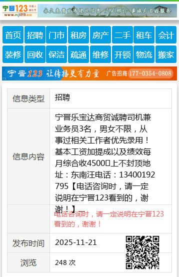 宁晋乐宝达商贸诚聘司机兼业务员3名,男女不限,从事过相关工作者优先录用!基本工资加提成以及绩效每月综合收4500➕上不封顶地址:东南汪电话:13400192795 【电话咨询时,请一定说明在宁晋123看到的,谢谢!】 |