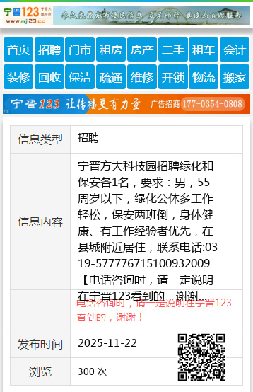宁晋方大科技园招聘绿化和保安各1名,要求:男,55周岁以下,绿化公休多工作轻松,保安两班倒,身体健康、有工作经验者优先,在县城附近居住,联系电话:0319-577776715100932009 【电话咨询时,请一定说明在宁晋123看到的,谢谢!】 |