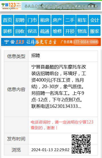 宁晋县最酷的汽车摩托车改装店招聘前台,环境好,工资4000元(不压工资,当月结),20-30岁,象气质佳。另招聘一名洗车工。上午9点-12点,下午2点到7点。联系电话16230134333 【电话咨询时,请一定说明在宁晋123看到的,谢谢!】 |