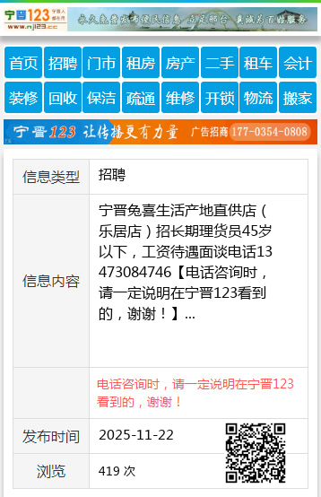 宁晋兔喜生活产地直供店(乐居店)招长期理货员45岁以下,工资待遇面谈电话13473084746