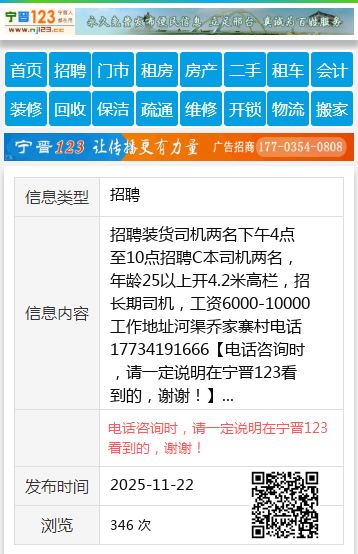 招聘装货司机两名下午4点至10点招聘C本司机两名,年龄25以上开4.2米高栏,招长期司机,工资6000-10000工作地址河渠乔家寨村电话17734191666 【电话咨询时,请一定说明在宁晋123看到的,谢谢!】 |