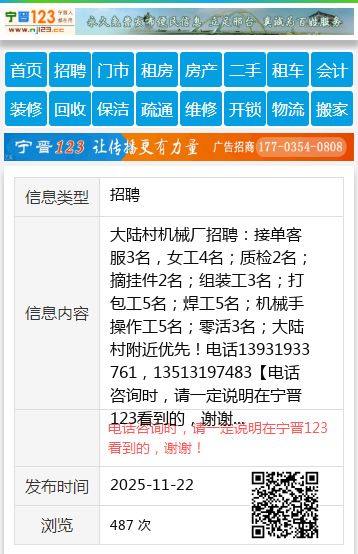 大陆村机械厂招聘:接单客服3名,女工4名;质检2名;摘挂件2名;组装工3名;打包工5名;焊工5名;机械手操作工5名;零活3名;大陆村附近优先!电话13931933761,13513197483 【电话咨询时,请一定说明在宁晋123看到的,谢谢!】 |
