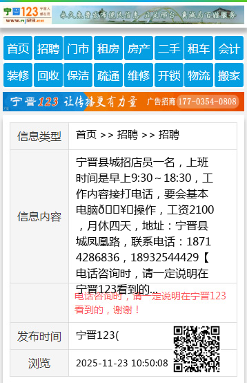 宁晋县城招店员一名,上班时间是早上9:30~18:30,工作内容接打电话,要会基本电脑🖥️操作,工资2100,月休四天,地址:宁晋县城凤凰路,联系电话:18714286836,18932544429 【电话咨询时,请一定说明在宁晋123看到的,谢谢!】 |