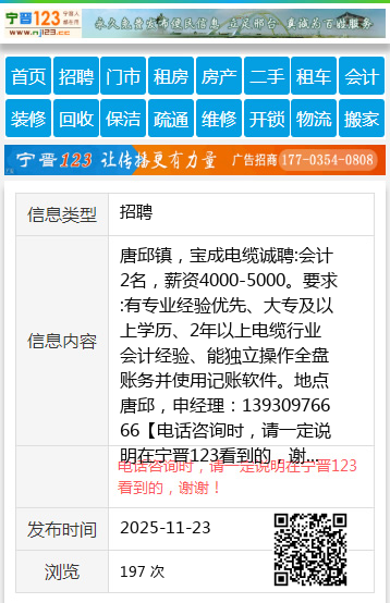唐邱镇,宝成电缆诚聘:会计2名,薪资4000-5000。要求:有专业经验优先、大专及以上学历、2年以上电缆行业会计经验、能独立操作全盘账务并使用记账软件。地点唐邱,申经理:13930976666 【电话咨询时,请一定说明在宁晋123看到的,谢谢!】 |