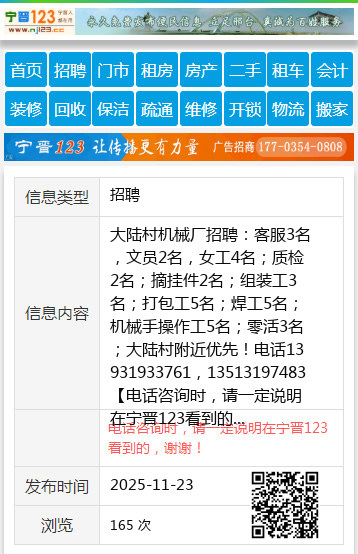 大陆村机械厂招聘:客服3名,文员2名,女工4名;质检2名;摘挂件2名;组装工3名;打包工5名;焊工5名;机械手操作工5名;零活3名;大陆村附近优先!电话13931933761,13513197483 【电话咨询时,请一定说明在宁晋123看到的,谢谢!】 |