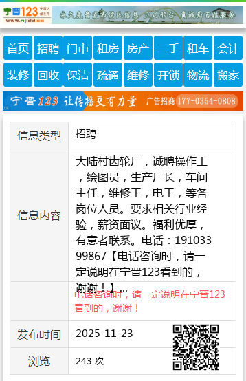 大陆村齿轮厂,诚聘操作工,绘图员,生产厂长,车间主任,维修工,电工,等各岗位人员。要求相关行业经验,薪资面议。福利优厚,有意者联系。电话:19103399867 【电话咨询时,请一定说明在宁晋123看到的,谢谢!】 |