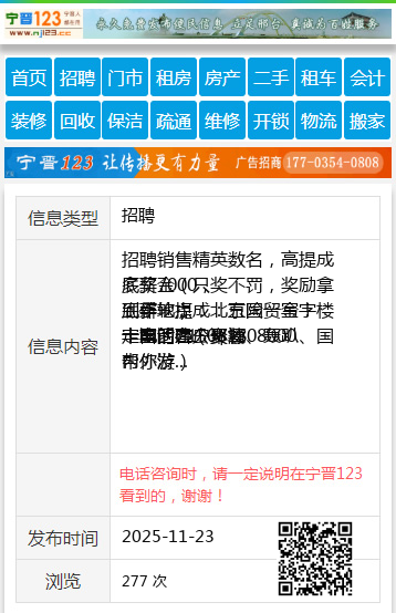 | 防骗提醒: | 宁晋123(www.nj123.cc)提醒您:手工活、网络兼职、刷单,都是骗子!凡以各种名义收取费用的都是骗子!找工作是往兜里挣钱,让你往外掏钱的都是骗子!异地招聘请提高警惕,谨防诈骗! |