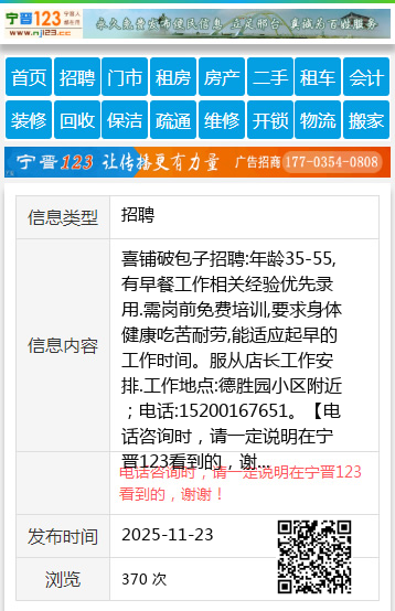喜铺破包子招聘:年龄35-55,有早餐工作相关经验优先录用.需岗前免费培训,要求身体健康吃苦耐劳,能适应起早的工作时间。服从店长工作安排.工作地点:德胜园小区附近;电话:15200167651。 【电话咨询时,请一定说明在宁晋123看到的,谢谢!】 |