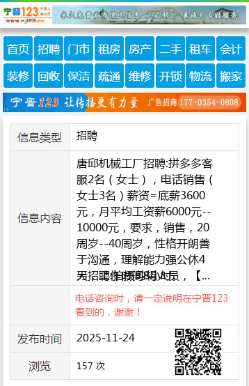 唐邱机械工厂招聘:拼多多客服2名(女士),电话销售(女士3名)薪资=底薪3600元,月平均工资薪6000元--10000元,要求,销售,20周岁--40周岁,性格开朗善于沟通,理解能力强公休4天,工作时间8小时。