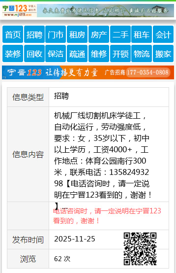 机械厂线切割机床学徒工,自动化运行,劳动强度低,要求:女,35岁以下,初中以上学历,工资4000+,工作地点:体育公园南行300米,联系电话:13582493298 【电话咨询时,请一定说明在宁晋123看到的,谢谢!】 |