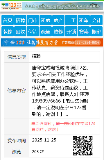 唐邱宝成电缆诚聘:统计2名。要求:有相关工作经验优先,可以熟练使用办公软件,工作认真。薪资待遇面议,工作地点唐邱,联系人:申经理13930976666 【电话咨询时,请一定说明在宁晋123看到的,谢谢!】 |