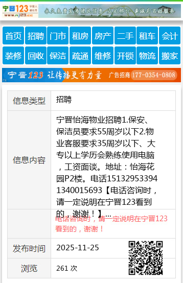宁晋怡海物业招聘1.保安、保洁员要求55周岁以下2.物业客服要求35周岁以下、大专以上学历会熟练使用电脑,工资面谈。地址:怡海花园P2楼。电话151329533941340015693 【电话咨询时,请一定说明在宁晋123看到的,谢谢!】 |