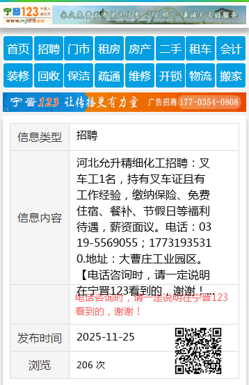 河北允升精细化工招聘:叉车工1名,持有叉车证且有工作经验,缴纳保险、免费住宿、餐补、节假日等福利待遇,薪资面议。电话:0319-5569055;17731935310.地址:大曹庄工业园区。 【电话咨询时,请一定说明在宁晋123看到的,谢谢!】 |