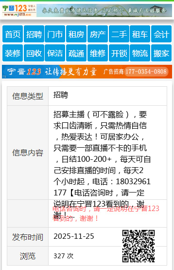 招募主播(可不露脸),要求口齿清晰,只需热情自信,热爱表达!可居家办公,只需要一部直播不卡的手机,日结100-200+,每天可自己安排直播的时间,每天2个小时起,电话:18032961177 【电话咨询时,请一定说明在宁晋123看到的,谢谢!】 |