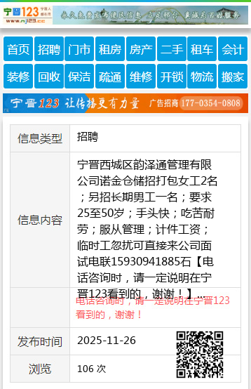 宁晋西城区韵泽通管理有限公司诺金仓储招打包女工2名;另招长期男工一名;要求25至50岁;手头快;吃苦耐劳;服从管理;计件工资;临时工忽扰可直接来公司面试电联15930941885石 【电话咨询时,请一定说明在宁晋123看到的,谢谢!】 |