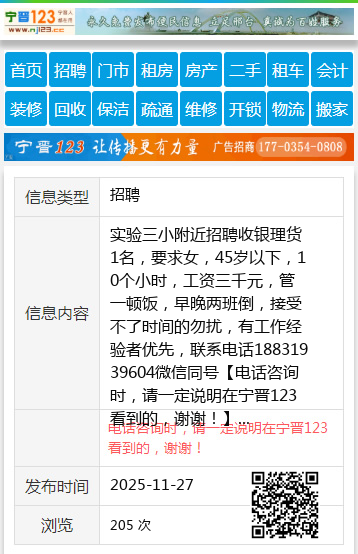 实验三小附近招聘收银理货1名,要求女,45岁以下,10个小时,工资三千元,管一顿饭,早晚两班倒,接受不了时间的勿扰,有工作经验者优先,联系电话18831939604微信同号 【电话咨询时,请一定说明在宁晋123看到的,谢谢!】 |