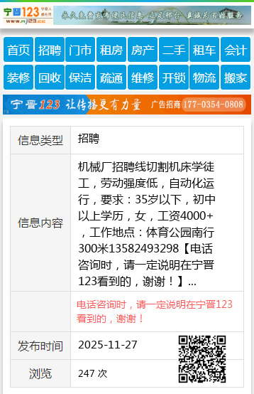 机械厂招聘线切割机床学徒工,劳动强度低,自动化运行,要求:35岁以下,初中以上学历,女,工资4000+,工作地点:体育公园南行300米13582493298 【电话咨询时,请一定说明在宁晋123看到的,谢谢!】 |