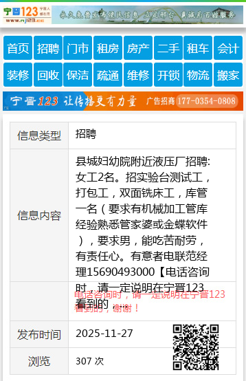 县城妇幼院附近液压厂招聘:女工2名。招实验台测试工,打包工,双面铣床工,库管一名(要求有机械加工管库经验熟悉管家婆或金蝶软件),要求男,能吃苦耐劳,有责任心。有意者电联范经理15690493000 【电话咨询时,请一定说明在宁晋123看到的,谢谢!】 |