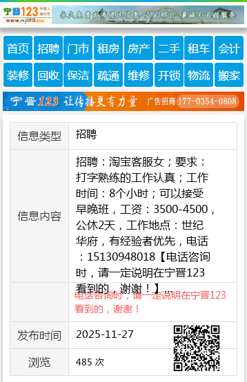 招聘:淘宝客服女;要求:打字熟练的工作认真;工作时间:8个小时;可以接受早晚班,工资:3500-4500,公休2天,工作地点:世纪华府,有经验者优先,电话:15130948018 【电话咨询时,请一定说明在宁晋123看到的,谢谢!】 |