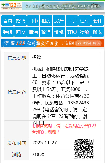 机械厂招聘线切割机床学徒工,自动化运行,劳动强度低,要求:35岁以下,高中及以上学历,工资4000+,工作地点:体育公园南行300米,联系电话:13582493298 【电话咨询时,请一定说明在宁晋123看到的,谢谢!】 |