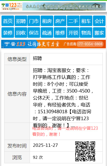 招聘:淘宝客服女;要求:打字熟练工作认真的;工作时间:8个小时;可以接受早晚班,工资:3500-4500,公休2天,工作地点:世纪华府,有经验者优先,电话:15130948018 【电话咨询时,请一定说明在宁晋123看到的,谢谢!】 |