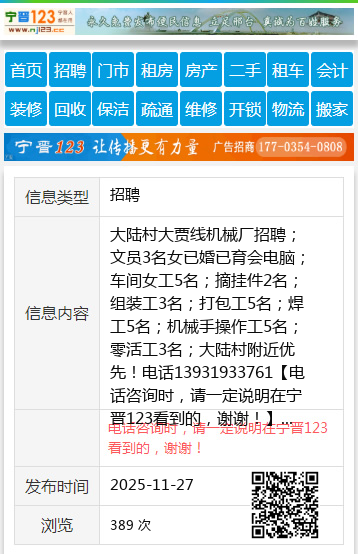 大陆村大贾线机械厂招聘;文员3名女已婚已育会电脑;车间女工5名;摘挂件2名;组装工3名;打包工5名;焊工5名;机械手操作工5名;零活工3名;大陆村附近优先!电话13931933761 【电话咨询时,请一定说明在宁晋123看到的,谢谢!】 |