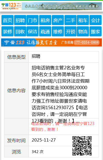 招电话销售主管2名业务专员6名女士业务简单每日工作7小时周六日双休法定假期底薪提成奖金3000到20000要求有销售经验沟通应变能力强工作地址御景世家请电话咨询15612930725 【电话咨询时,请一定说明在宁晋123看到的,谢谢!】 |