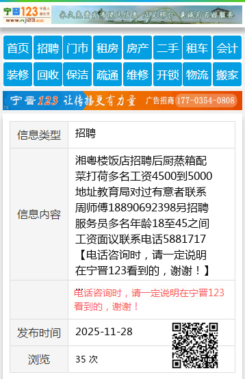 湘粤楼饭店招聘后厨蒸箱配菜打荷多名工资4500到5000地址教育局对过有意者联系周师傅18890692398另招聘服务员多名年龄18至45之间工资面议联系电话5881717