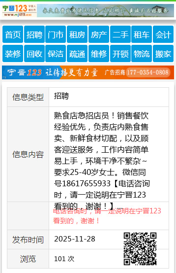 熟食店急招店员!销售餐饮经验优先,负责店内熟食售卖、新鲜食材切配,以及顾客迎送服务,工作内容简单易上手,环境干净不繁杂~要求25-40岁女士。微信同号18617655933 【电话咨询时,请一定说明在宁晋123看到的,谢谢!】 |