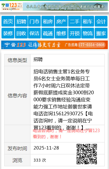 招电话销售主管1名业务专员6名女士业务简单每日工作7小时周六日双休法定带薪假底薪提成奖金3000到20000要求销售经验沟通应变能力强工作地址御景世家请电话咨询15612930725 【电话咨询时,请一定说明在宁晋123看到的,谢谢!】 |