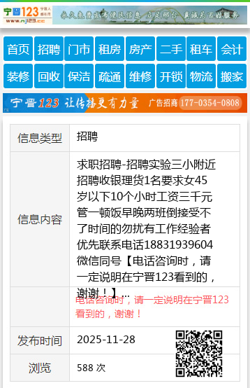 求职招聘-招聘实验三小附近招聘收银理货1名要求女45岁以下10个小时工资三千元管一顿饭早晚两班倒接受不了时间的勿扰有工作经验者优先联系电话18831939604微信同号 【电话咨询时,请一定说明在宁晋123看到的,谢谢!】 |