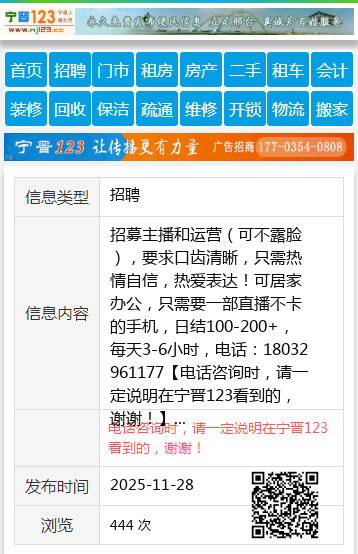 招募主播和运营(可不露脸),要求口齿清晰,只需热情自信,热爱表达!可居家办公,只需要一部直播不卡的手机,日结100-200+,每天3-6小时,电话:18032961177 【电话咨询时,请一定说明在宁晋123看到的,谢谢!】 |