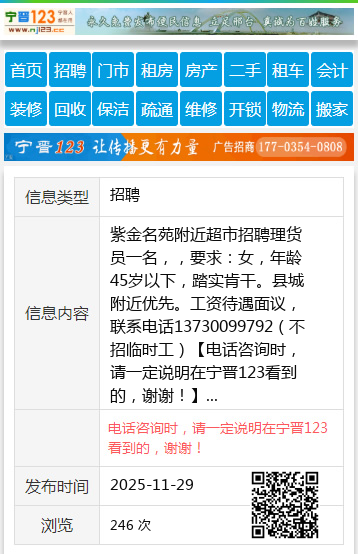 | 防骗提醒: | 宁晋123(www.nj123.cc)提醒您:手工活、网络兼职、刷单,都是骗子!凡以各种名义收取费用的都是骗子!找工作是往兜里挣钱,让你往外掏钱的都是骗子!异地招聘请提高警惕,谨防诈骗! |