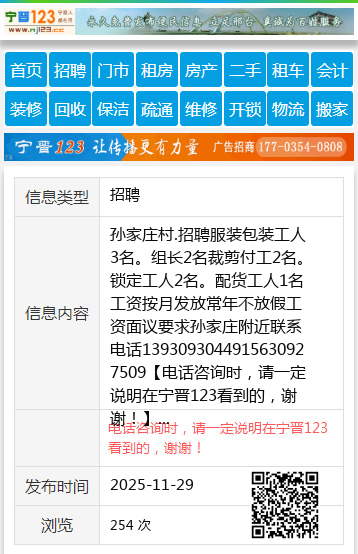 | 防骗提醒: | 宁晋123(www.nj123.cc)提醒您:手工活、网络兼职、刷单,都是骗子!凡以各种名义收取费用的都是骗子!找工作是往兜里挣钱,让你往外掏钱的都是骗子!异地招聘请提高警惕,谨防诈骗! |