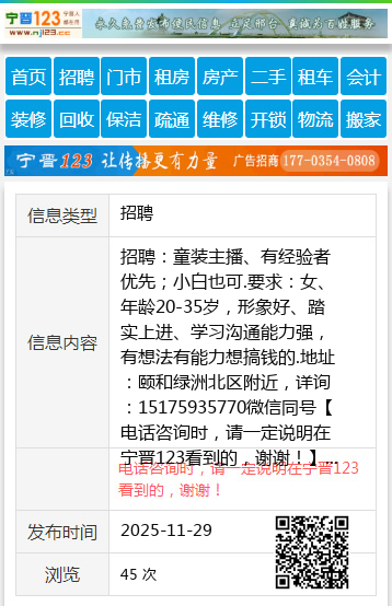 招聘:童装主播、有经验者优先;小白也可.要求:女、年龄20-35岁,形象好、踏实上进、学习沟通能力强,有想法有能力想搞钱的.地址:颐和绿洲北区附近,详询:15175935770微信同号 【电话咨询时,请一定说明在宁晋123看到的,谢谢!】 |