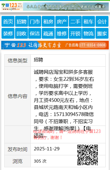 诚聘网店淘宝和拼多多客服,要求:女生22到36岁左右,使用电脑打字,需要倒班,学历要求高中以上学历,月工资4500元左右,地点:县城状元路南天和城小区内,电话:15713094578微信同号(不招兼职,不招实习生,感谢理解[抱拳]) 【电话咨询时,请一定说明在宁晋123看到的,谢谢!】 |