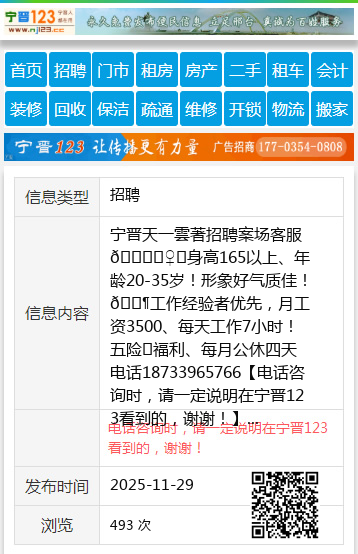 宁晋天一雲著招聘案场客服💁♀️身高165以上、年龄20-35岁!形象好气质佳!🈶工作经验者优先,月工资3500、每天工作7小时!五险➕福利、每月公休四天电话18733965766 【电话咨询时,请一定说明在宁晋123看到的,谢谢!】 |