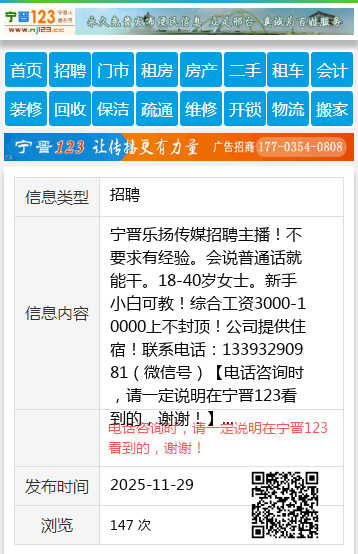 宁晋乐扬传媒招聘主播!不要求有经验。会说普通话就能干。18-40岁女士。新手小白可教!综合工资3000-10000上不封顶!公司提供住宿!联系电话:13393290981(微信号) 【电话咨询时,请一定说明在宁晋123看到的,谢谢!】 |