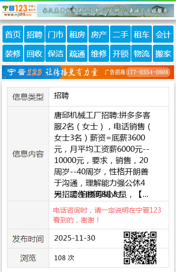 唐邱机械工厂招聘:拼多多客服2名(女士),电话销售(女士3名)薪资=底薪3600元,月平均工资薪6000元--10000元,要求,销售,20周岁--40周岁,性格开朗善于沟通,理解能力强公休4天,工作时间8小时。