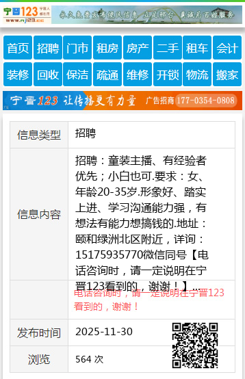 招聘:童装主播、有经验者优先;小白也可.要求:女、年龄20-35岁.形象好、踏实上进、学习沟通能力强,有想法有能力想搞钱的.地址:颐和绿洲北区附近,详询:15175935770微信同号 【电话咨询时,请一定说明在宁晋123看到的,谢谢!】 |