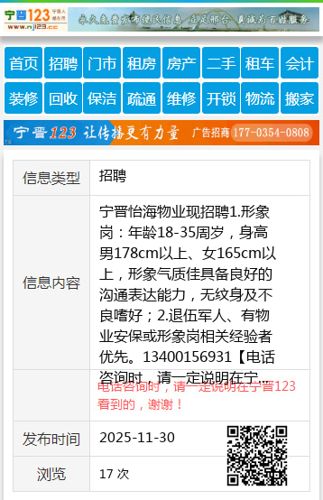 宁晋怡海物业现招聘1.形象岗:年龄18-35周岁,身高男178cm以上、女165cm以上,形象气质佳具备良好的沟通表达能力,无纹身及不良嗜好;2.退伍军人、有物业安保或形象岗相关经验者优先。13400156931 【电话咨询时,请一定说明在宁晋123看到的,谢谢!】 |