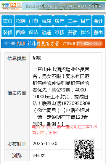 宁晋山庄老酒招聘业务员两名,男女不限!要求有白酒销售经验或快销品销售经验者优先!薪资待遇;4000--10000元上不封顶,提成日结!联系电话18730950808(微信同号) 【电话咨询时,请一定说明在宁晋123看到的,谢谢!】 |