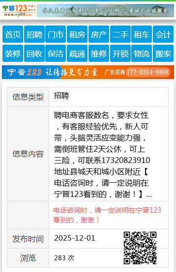 聘电商客服数名,要求女性,有客服经验优先,新人可带,头脑灵活应变能力强,需倒班管住2天公休,可上三险,可联系17320823910地址县城天和城小区附近 【电话咨询时,请一定说明在宁晋123看到的,谢谢!】 |